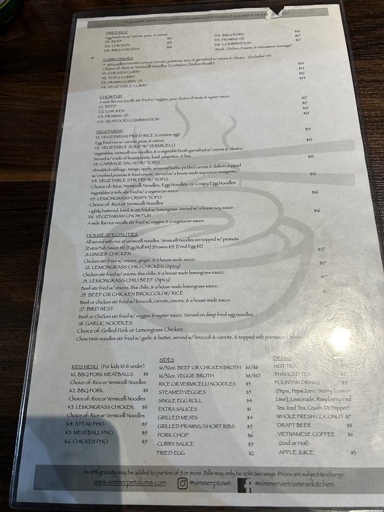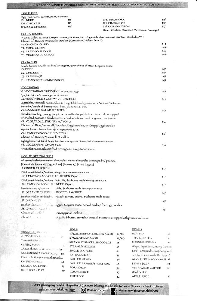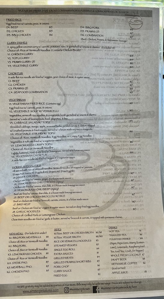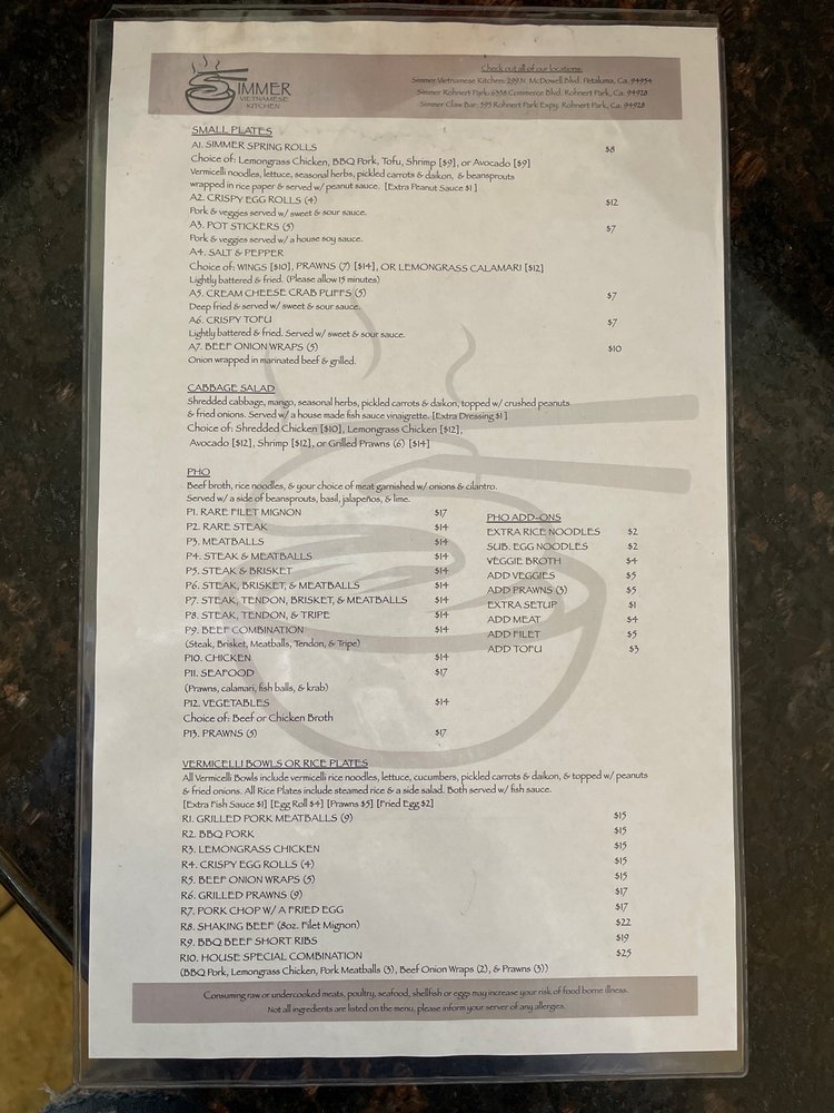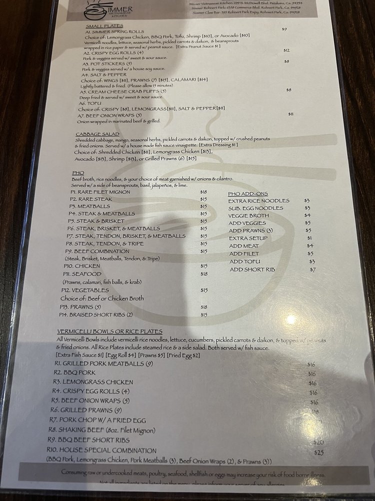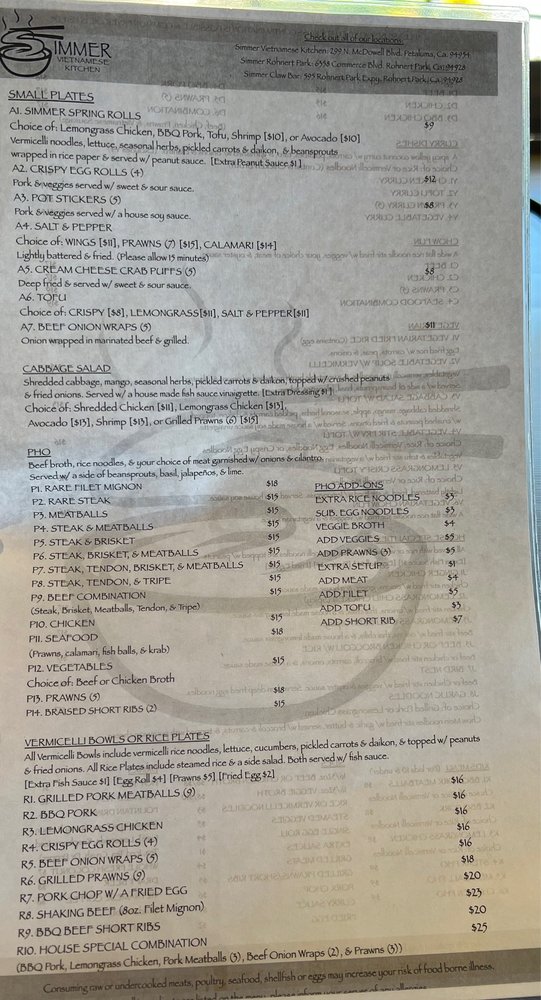 Introducing Simmer Vietnamese Kitchen, a cozy spot in Petaluma, CA, offering a variety of Vietnamese delights. The menu boasts vegan and vegetarian options, with generous portions and friendly service. Standout dishes include the R10 noodles, lemon grass chicken, grilled pork chops, and flavorful pho selections. The staff goes above and beyond to make diners feel welcome, whether dining in or opting for takeout. The dishes are packed with authentic flavors and perfectly cooked meats, leaving customers satisfied every time. Don't miss out on the avocado & shrimp spring rolls and Vietnamese iced coffee. With a bustling atmosphere and stellar reviews, Simmer Vietnamese Kitchen is a must-visit for Vietnamese cuisine enthusiasts.