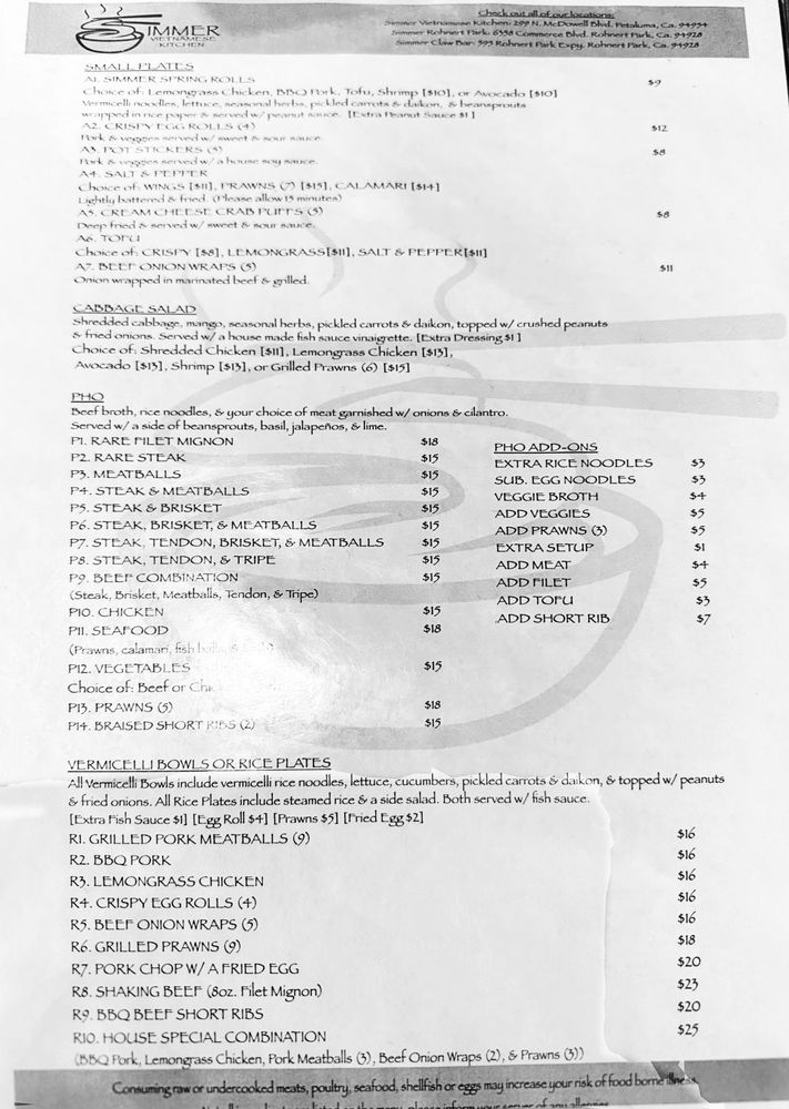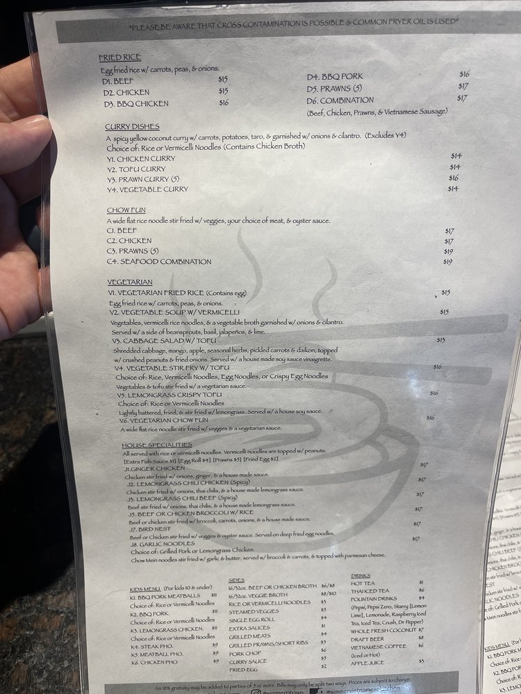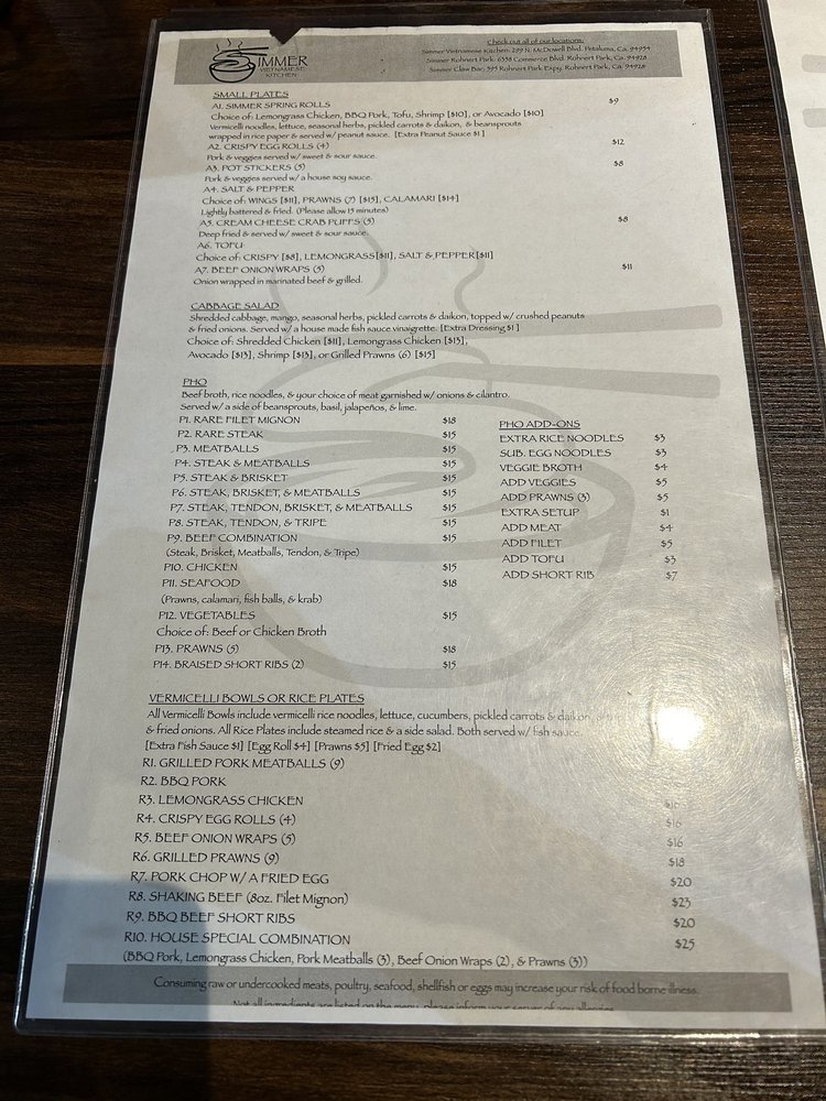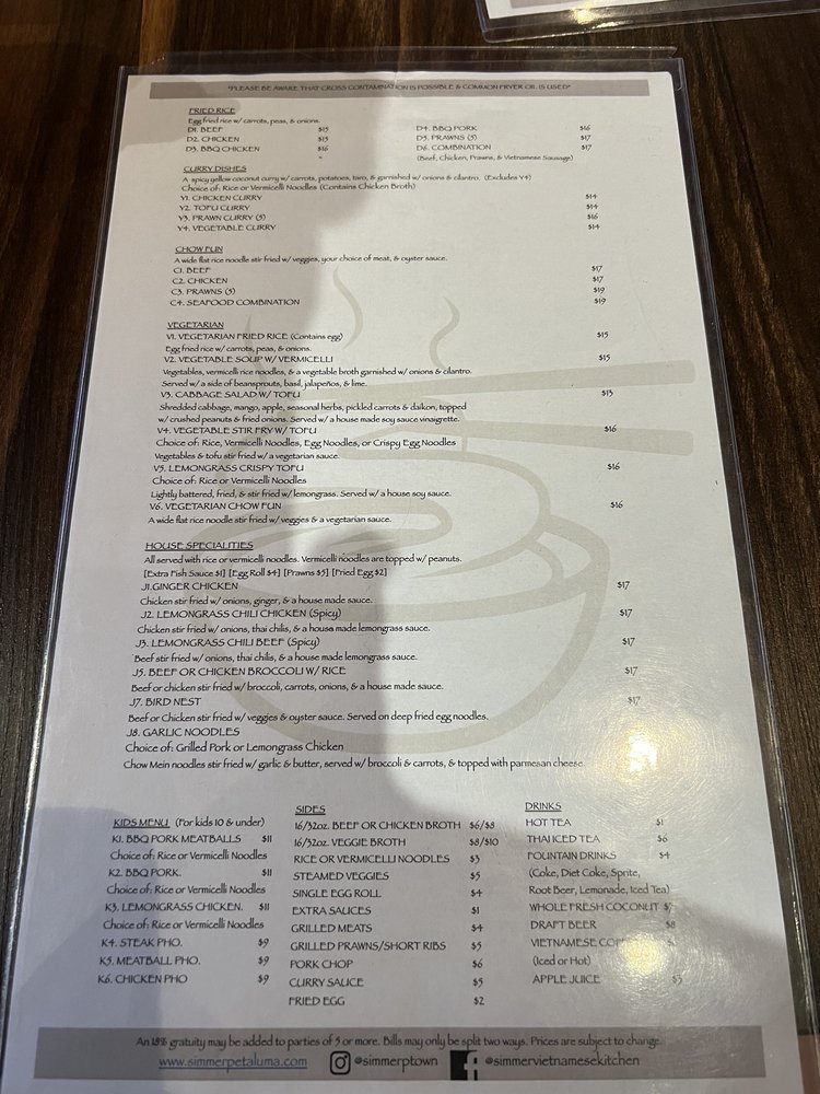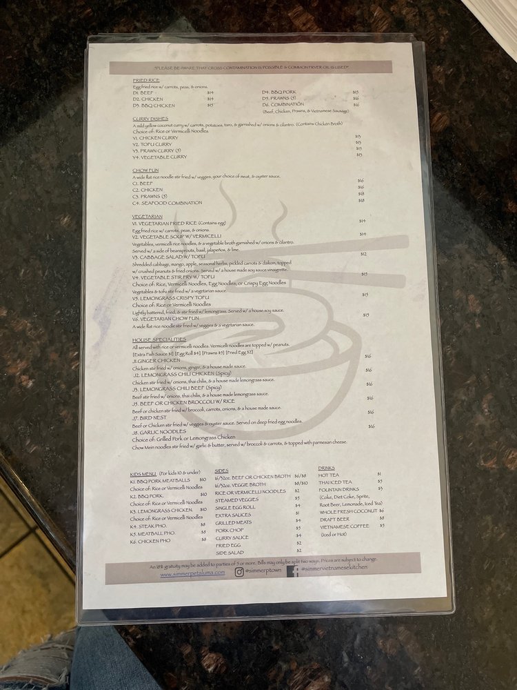Introducing Simmer Vietnamese Kitchen, a cozy spot in Petaluma, CA, offering a variety of Vietnamese delights. The menu boasts vegan and vegetarian options, with generous portions and friendly service. Standout dishes include the R10 noodles, lemon grass chicken, grilled pork chops, and flavorful pho selections. The staff goes above and beyond to make diners feel welcome, whether dining in or opting for takeout. The dishes are packed with authentic flavors and perfectly cooked meats, leaving customers satisfied every time. Don't miss out on the avocado & shrimp spring rolls and Vietnamese iced coffee. With a bustling atmosphere and stellar reviews, Simmer Vietnamese Kitchen is a must-visit for Vietnamese cuisine enthusiasts.